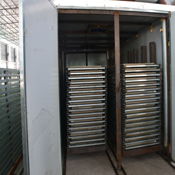 石英石板胚放在平鋪層疊的烘烤架上,利用軌道滑進烘烤。石英石板胚固化上色以后也是通過烘烤架整體轉移。